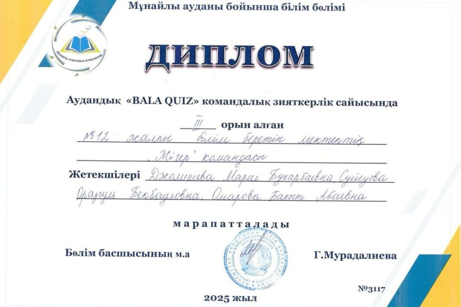 Аудандық “BALA QUIZ”командалық зияткерлік сайысында “Жігер” командасы 🥉орынды иеленді. Жетекшілері:…Маусым 14, 2025